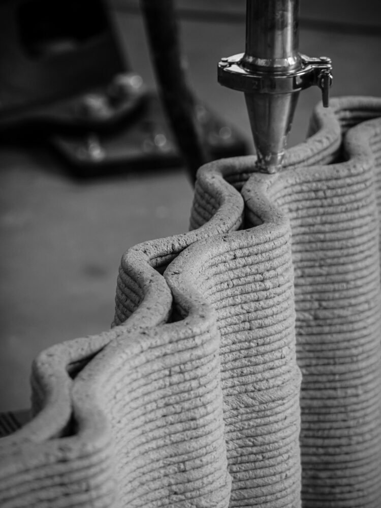 CORNCRETL is a bio-based construction material derived from limestone aggregates, corn residues, and recycled nejayote, the calcium-rich wastewater produced during the nixtamalization of corn. The research combines references to pre-Hispanic Mayan construction techniques with robotic 3D printing technologies. Compared to conventional concrete, the material achieves up to a 70 percent reduction in carbon emissions while operating within a circular economy framework.
