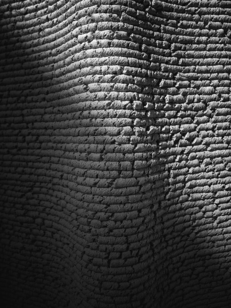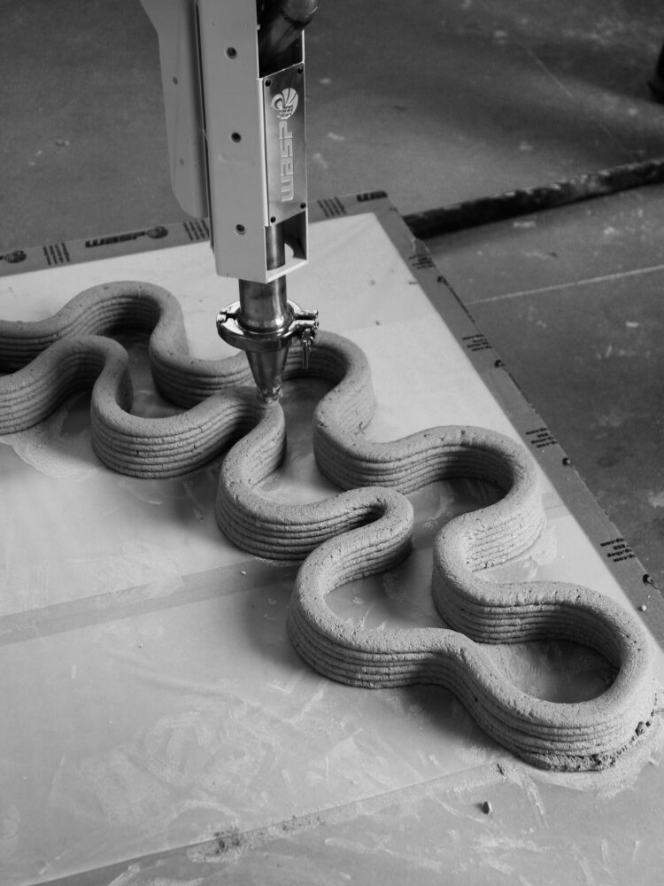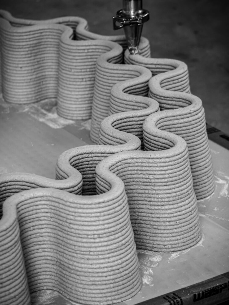 Additive manufacturing eliminates the need for conventional formwork, reducing material waste by up to 90 percent while enabling geometric precision. During the WASP Residency 2025 in Massa Lombarda, Italy, research focused on refining the mix and testing scalability for architectural applications. Structural assessments evaluated compressive performance and material usage per linear meter. Modular wall panels measuring 40 cm, 60 cm, and 80 cm in height were developed as potential components for lightweight, low-cost housing systems. The wall geometries referenced terrazzo motifs from Rimini, demonstrating the material’s capacity for pattern, curvature, and non-rectilinear forms. By combining agricultural waste streams, lime-based mineral systems, and robotic fabrication, CORNCRETL positions bio-based construction as both a technical and cultural proposition.
