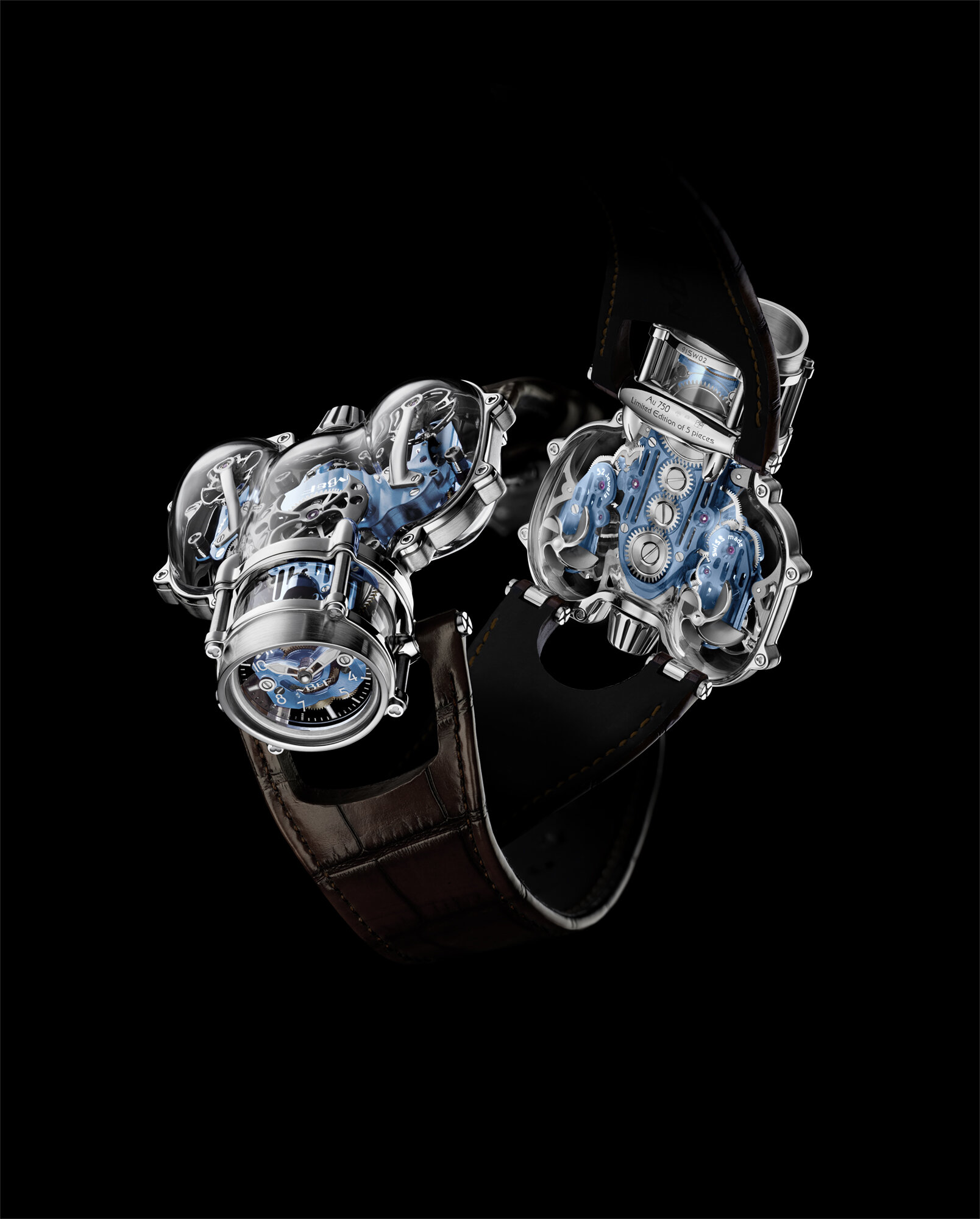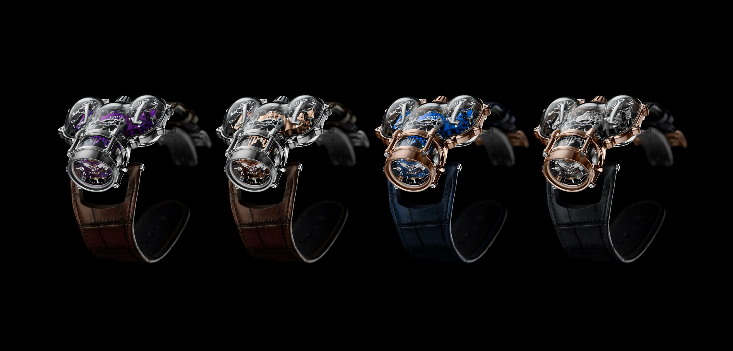 There are now six editions of HM9 Sapphire Vision, with different colors and materials. Two new editions, limited to only five pieces each, were introduced in 2023: one with a white gold frame and blue CVD movement and another with a yellow gold frame and a green engine.