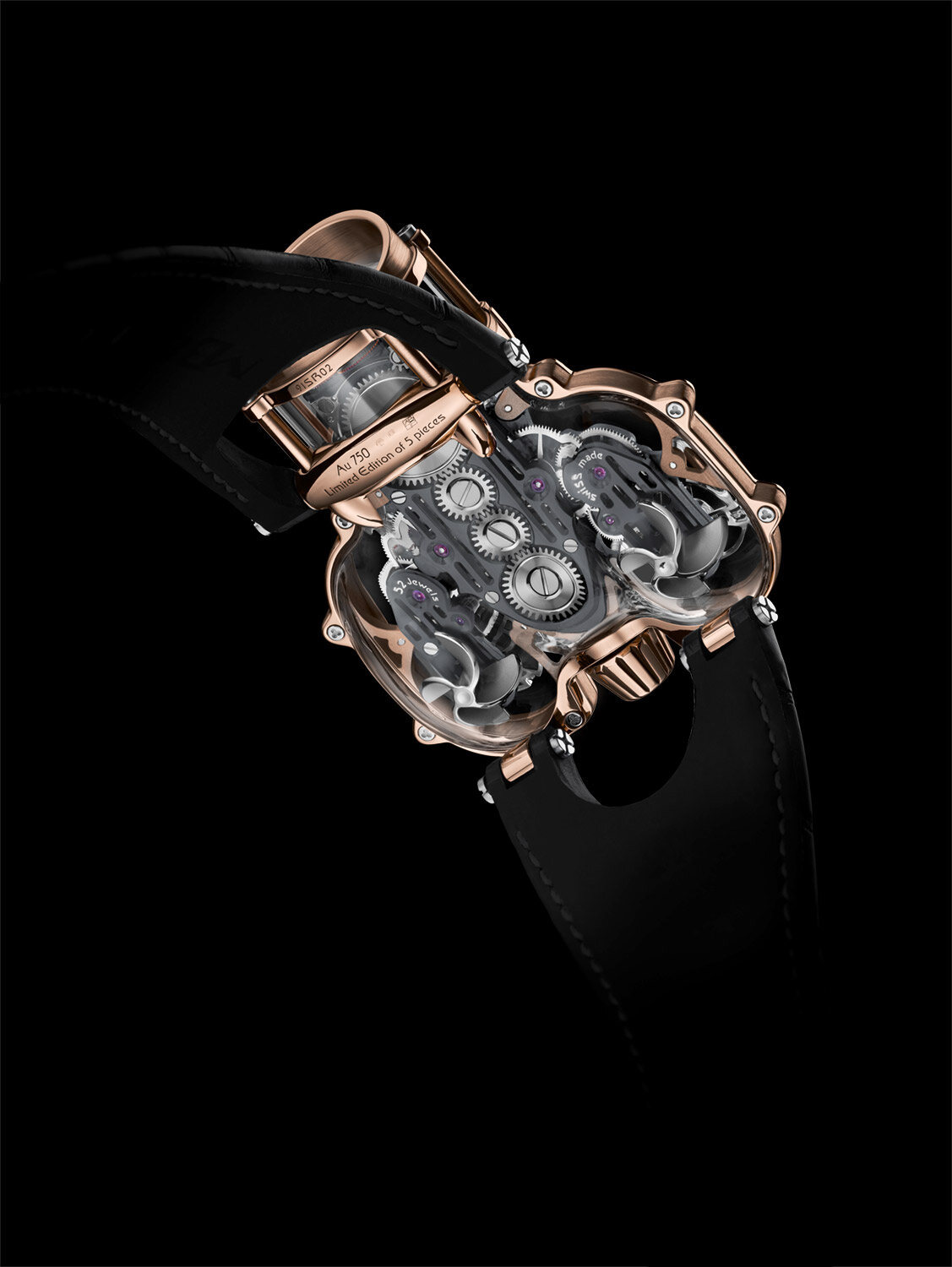 the HM9 engine combines a unique arrangement of gears, wheels, and bridges within a crystal-clear case