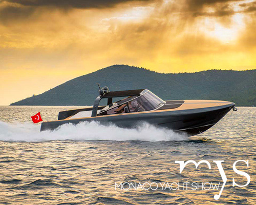 either side of the wooden foredeck, two further black fabric recliners are arranged in order to maximize flexibility, while jet skis and paddle boards can also be accommodated. envisioned as the cover of a sports car, a black fabric shading screen can partially or fully enclose the yacht’s seating area – protecting the craft in all weathers.