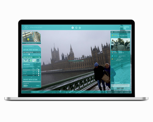 registered users of ‘omnipresenz’ has an interface similar to a video game and a chat room because of the avatar’s audio and live video stream positioned in the center of the screen, and the request action screens on the right and left. viewers can guide the actions of the human in real-time, located in areas of cities around the world, so that the telepresent tourist can see and hear from their point of view. the project is currently being funded by its indiegogo campaign in order to make the system a reality.
