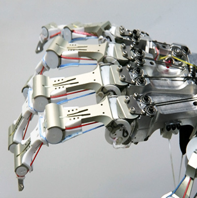 left: the arm integrated into a fuller robotic system right: detail on the fingers of the current model