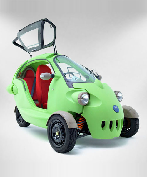 this little bug-eyed three-wheeled electric vehicle is called ‘sam’. the vehicle’s cartoon-like form, made of fully-recyclable high-density polyethylene, consists of only four panels and is accessed via a folding gull-wing door. its roomy interior provides enough space for both driver and passenger to ride in comfort.