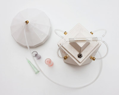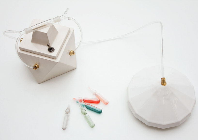 based on current ‘headspace capture’ perfumery technology, the ‘madeleine’ by london-based designers amy radcliffe and helene combal-weiss is an analogue odour camera, working in much the same way as a 35mm camera does. the ‘scentography’ device records light information from visual imagery to create replicas of molecular data and information from specific smells. conceived with reference to post-visual past time experiences, the photographic machine manipulates one’s emotional well being through prescribed nostalgia–that is, by exploiting the functional use of conditioned scent memory and olfactory senses. to process the ‘scentographic’ captures, one would have to place a class enclosure over their desired object of choice to harvest its aura. a pump then sucks the air across an odor trap, where potion-like fragrance samples manifest as liquids, which if needed, can be later be processed at a fragrance lab in a gas chromatography–mass spectrometry machine.