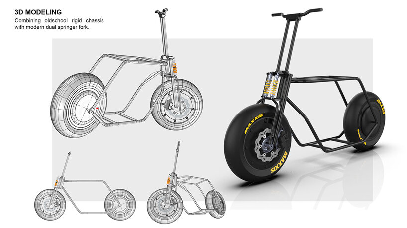 Inspired by spacecraft—both real and fictional—STELLAR features a layered geometry and a lightweight metallic body made from bent aluminum sheets. The design is in fact based on the Quest Atom Alpha EV chassis. Ismail calls it his ‘personal project to create a customized electric scooter based on Quest Atom Alpha EV chassis’.