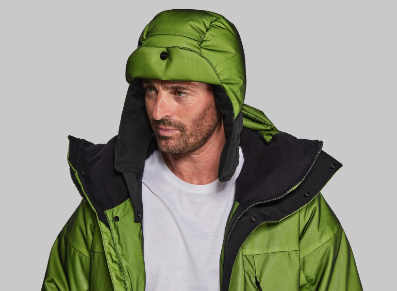Moving up to the body, parka and jacket hoods are often insulated with the same material as the entire outfit. However, this does not mean designers cannot have fun with the hood’s style. At least for Vollebak, this is the case. Its insulated Solar Charged Hat glows in the dark at night like a green firefly, transforming the wearer into a human lamp when darkness falls. The hat is engineered with a three-layered material: ultra-soft fleece lining and insulation followed by water and wind-resistant fabric, concluded with adjustable storm flaps reinforced with Cordura panels.