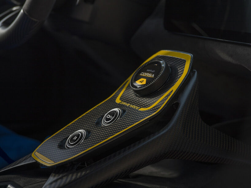the car’s interior combines racing elements like carbon-fiber monocoque seats with luxury touches