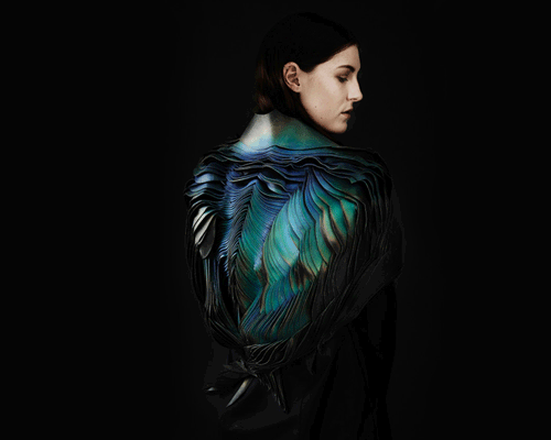 london-based artist lauren bowker and her material exploration studio THE UNSEEN has developed a form of wind reactive ink that changes color according to different fluctuations in the air and around the body. demonstrated in a couture capsule collection designed for swarovski entitled ‘air’, the biological and chemical technology is integrated into layers of fabrics, morphing its RGB values in response to pressure change. similar to how formula one visualizes aerodynamics, through strands of color surrounding the car, ‘air’ is able to translate an environmental force into a graphic display.