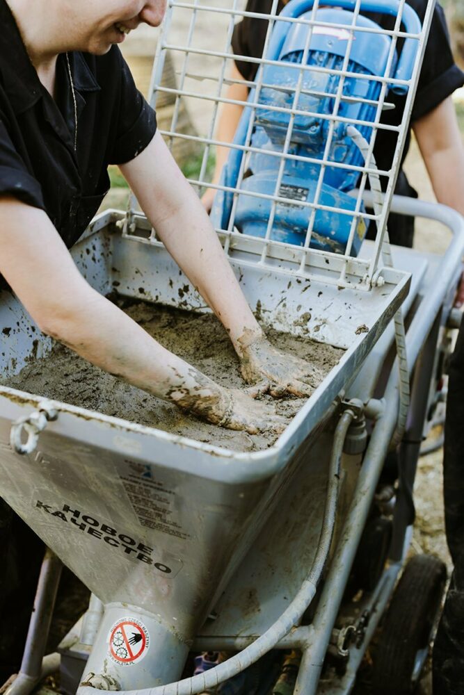 a custom-made robotic arm linked to a computer builds small structures out of a raw mix of soil and seeds