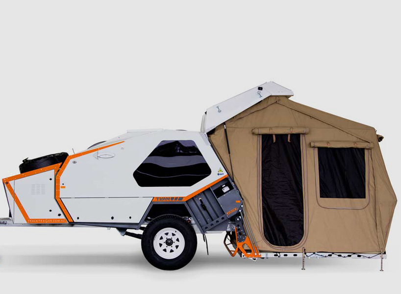 track trailer’s mk iv ‘tvan’ camper trailer shares the same off-road DNA as its predecessors, with several improvements including larger cabin space; more head room above the bed; refined electrics; two kitchen configurations; and added storage. the principal features of the ‘tvan’ camper trailer are its quick erect tent, stored in its own compartment (not on the bed); and the dynamically styled body which continues to set it apart from the rest, without compromises.