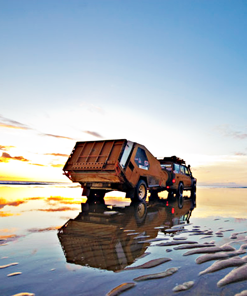 each track trailer ‘tvan’ model features ‘MC2’ suspension; hot dipped galvanized chassis; durable riveted steel and aluminum construction of the cabin and lower body lockers; aluminum rear folding platform (deck); off-road electric brakes; and fully articulated off-road coupling. all other specifications, options and accessories are bespoke made, allowing owners to customise their ‘tvan’ to match their camping preferences; tow vehicle’s capabilities; and budget. the ‘tvan’ models are instantly identifiable by their highlighted colors: ‘yulara’ blue; ‘tanami’ green; ‘canning’ red; and ‘murranji’ orange.