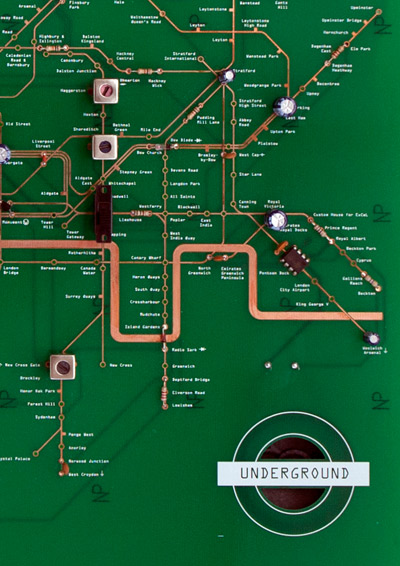 london underground map diagrams. by strategically positioning certain speaker, resistor and battery components throughout the map,