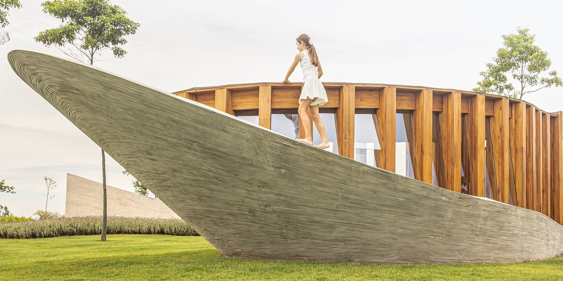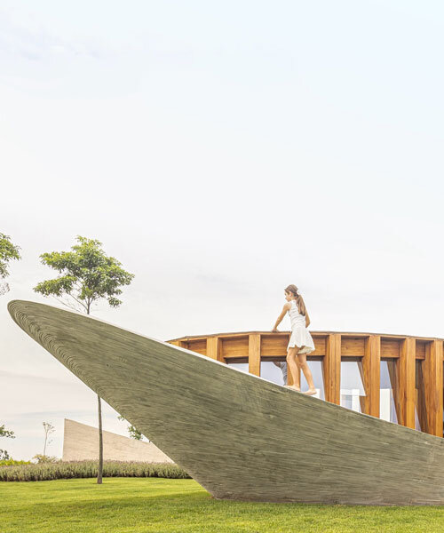 the 414-square-meter pavilion uses earth-covered timber arches to reconstruct the silhouette of a hill.